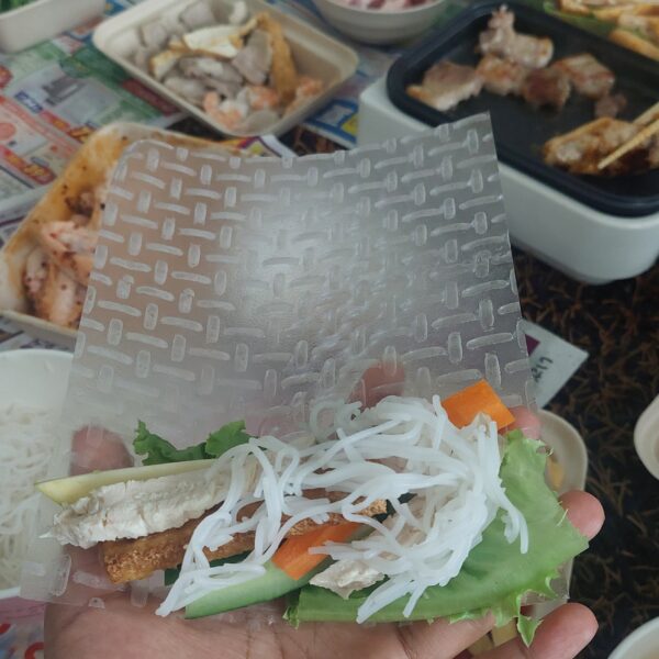 ニンジン、キュウリ、レタス、鶏肉、エビ、豆腐、春梅、摘果マンゴーをライスペーパーで包み、ぐるぐる巻いてからタレソースにつけて食べました。